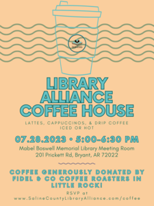 f you like coffee, reading, and friendly faces (and we know you definitely do if you're here), then join us on Friday, July 28th for our SCLA Coffee House event! We will be making fresh drip coffee, lattes, and cappuccinos with freshly roasted coffee kindly donated to us by Fidel & Co Coffee Roasters in Little Rock. We will be at the Mabel Boswell Memorial Library in Bryant from 5:00-6:30 P.M., and it will be a drop-in, drop-out event! Stop by and grab a coffee, chat with some fellow library supporters, do some reading, and help write letters/postcards!